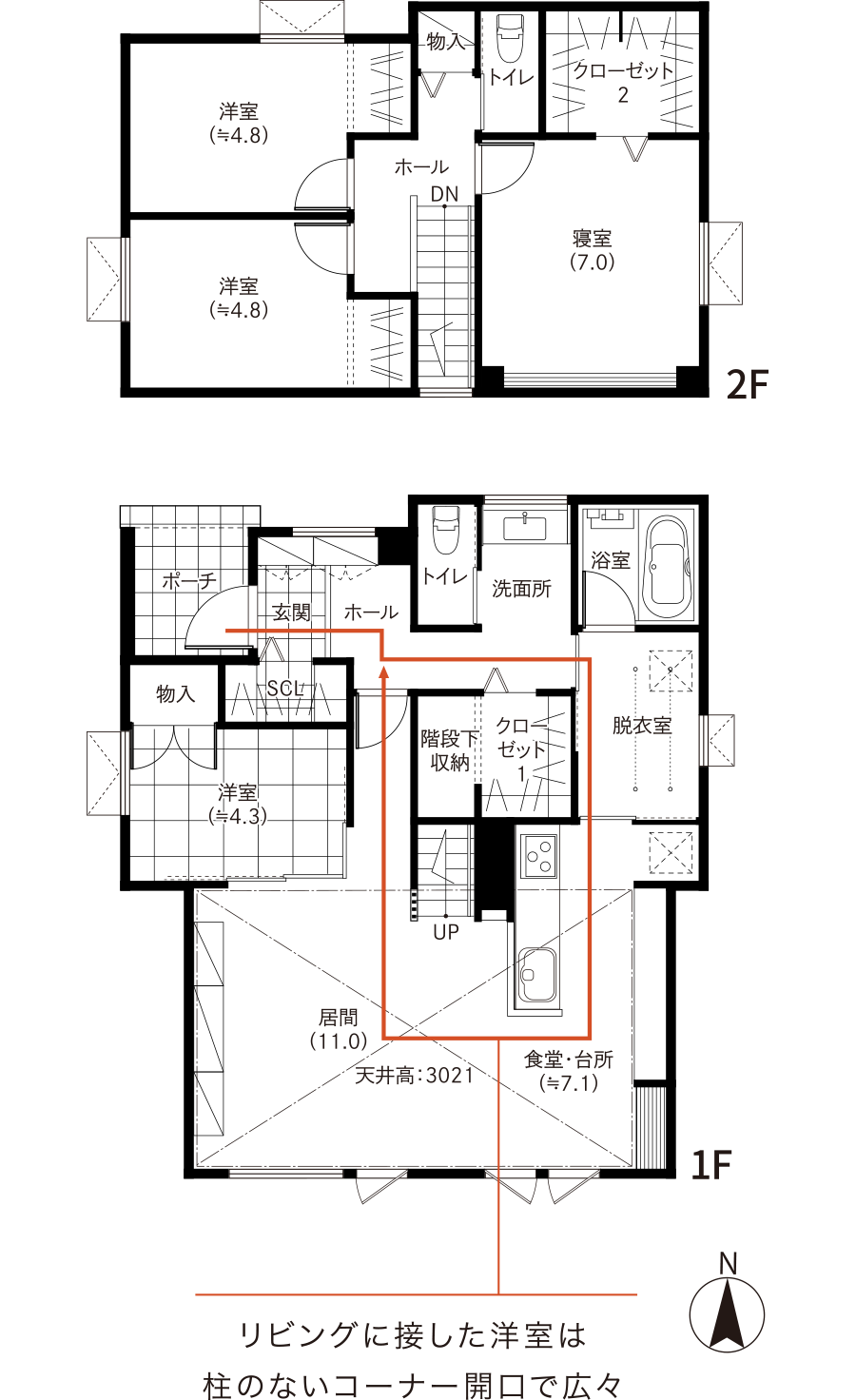 天井の高さが、視線と気持ちの境界をほどく。思わず伸びたくなる開放感。光と風が通るリビングで、家族の毎日がゆるやかに動き出す。家族共有のクローゼットとキッチンを中心にした回遊動線で、毎日の家事もラクラク。万が一の地震でも安心できる「制震装置MGEO」搭載住宅です。